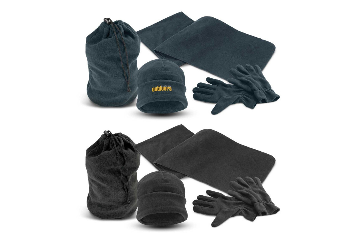 Delightful scarf, beanie and gloves set which is manufactured from warm, non-pilling polar fleece and is presented is a matching drawstring bag. The beanie has a roll up cuff and is available in one size which will fit most people. The gloves are available unbranded in one size and can be clipped together when not in use.