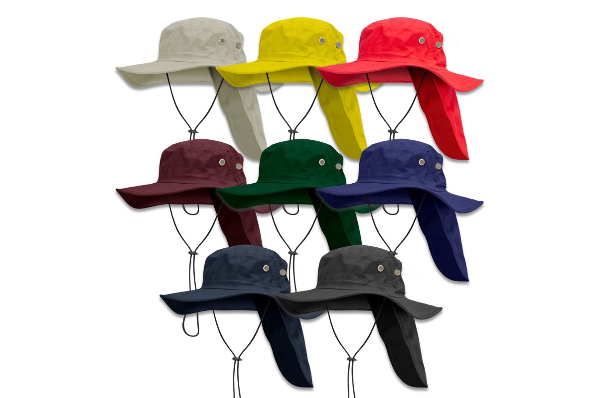 Dependable wide-brimmed hat that provides excellent coverage and sun protection. Made from 100% cotton twill, it offers UPF50 sun protection and a neck flap for additional coverage. The hat also features stainless steel eyelets and is ideal for uniforms and childcare centres.