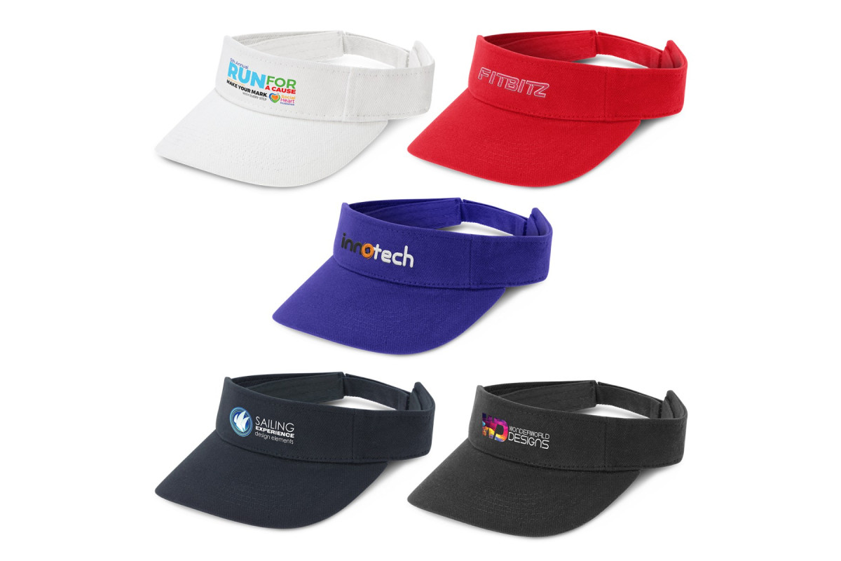 Premium quality cotton twill sun visor with a pre-curved peak, a sweatband and an adjustable Velcro closure which allows one size to fit most people.