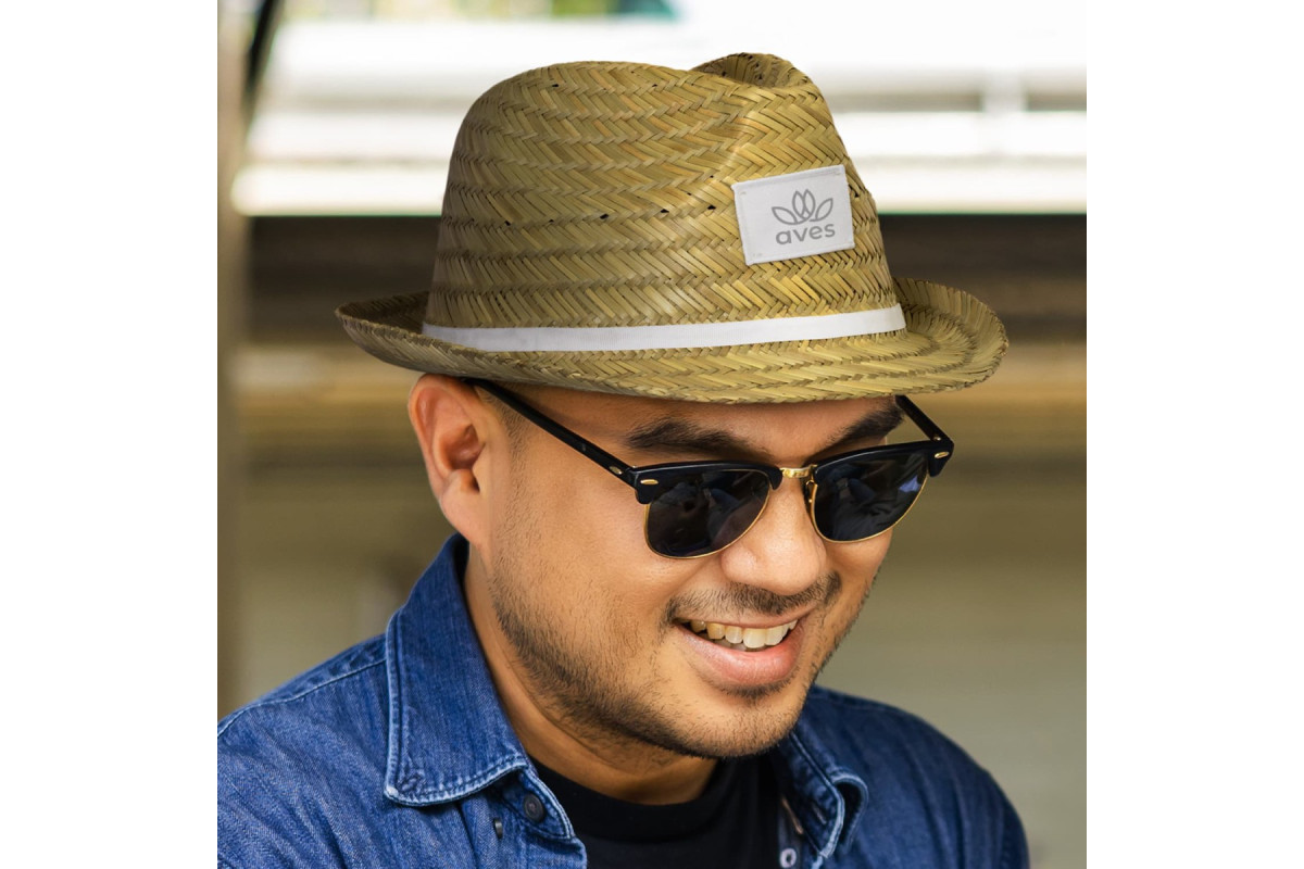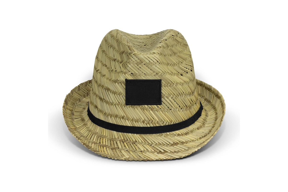Classic straw fedora with a coloured polyester ribbon and a polyester patch for convenient and prominent branding.